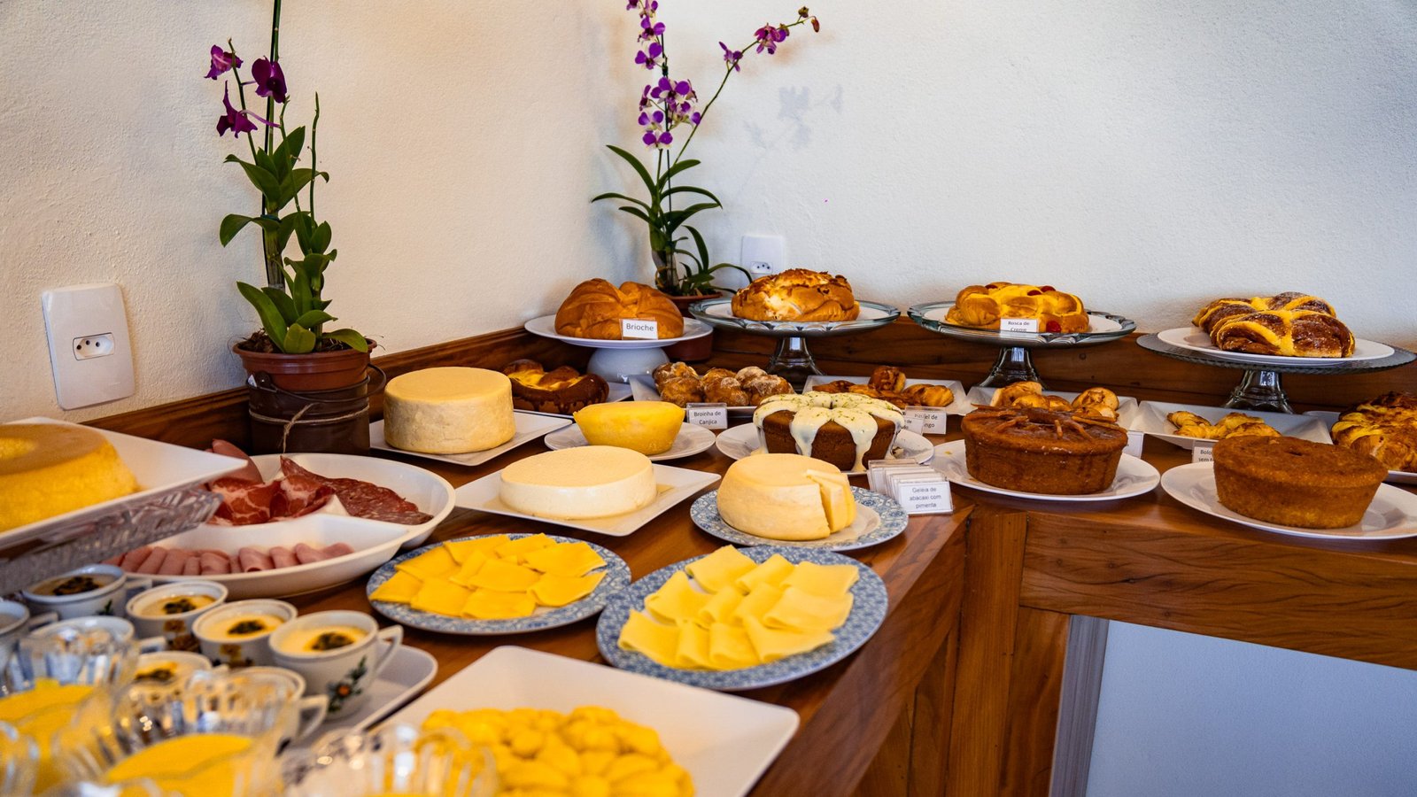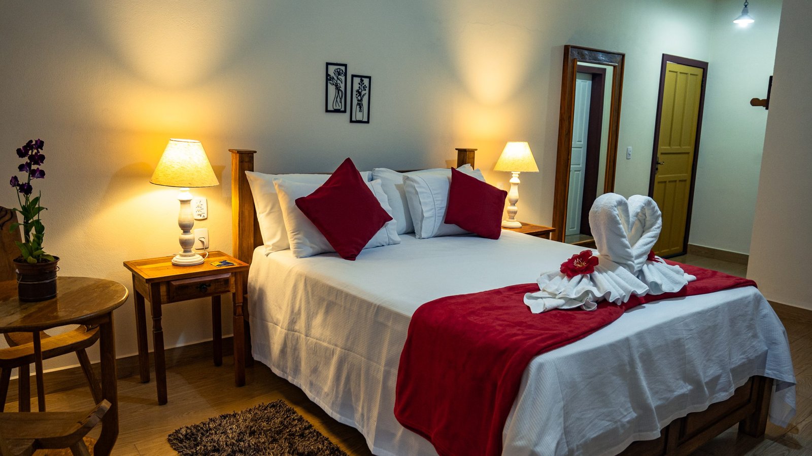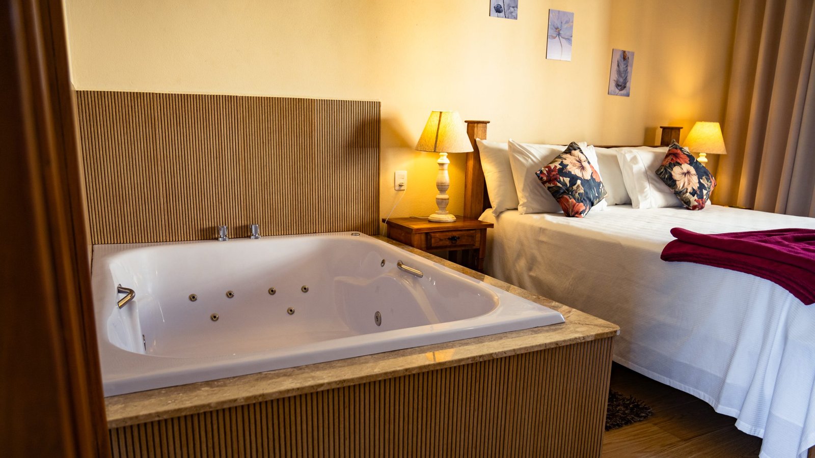 Nossas suítes são espaçosas, bem arejadas e equipadas com tudo o que você precisa para uma estadia confortável. Com camas aconchegantes, enxoval de qualidade, TV, frigobar e Wi-Fi, elas combinam perfeitamente o charme rústico com toques de modernidade. Algumas acomodações contam com vista para a serra, e outras oferecem, além da vista deslumbrante, uma sacada — o lugar ideal para quem busca momentos de paz e conexão com a natureza.